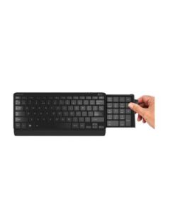Compact keyboard with an integral number pad that easily slides out sideways (right hand slide only) to expose the fully functioning number pad. This avoids the need to have an extra number pad as with many other compact keyboards. An extensive range of function keys makes this keyboard an exceptional all round compact keyboard for the office or multimedia environments where space is a premium.